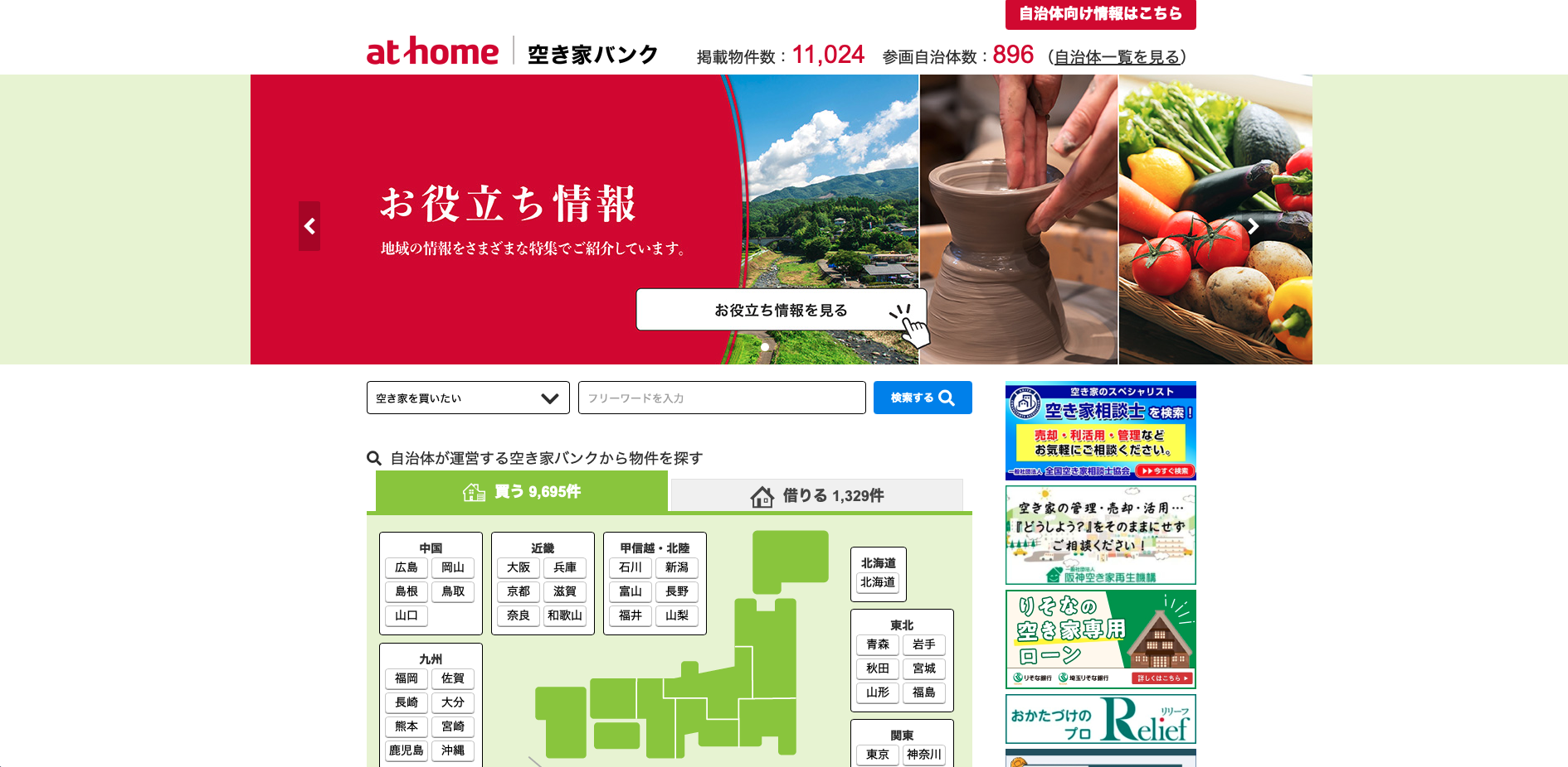 アットホーム 空き家バンクは、全国の自治体が運営する空き家バンク登録物件を探せるサービスです。売買用・賃貸用を地域から探しやすいため、地方移住や空き家活用の入口として使いやすいです。