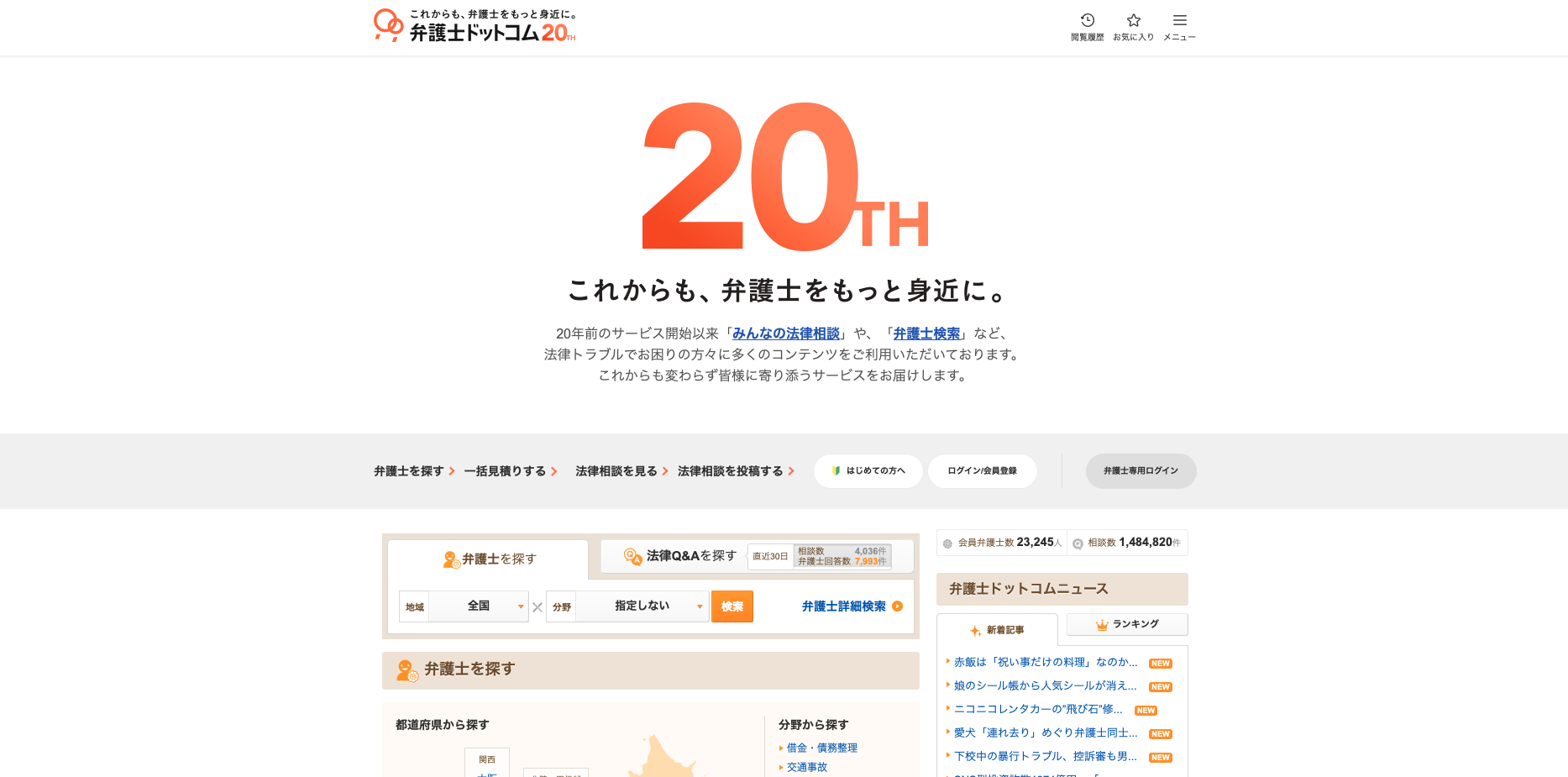 弁護士ドットコムは、離婚、相続、交通事故、債務整理、労働問題など、生活に近い法律トラブルの相談先探しで使いやすいサービスです。