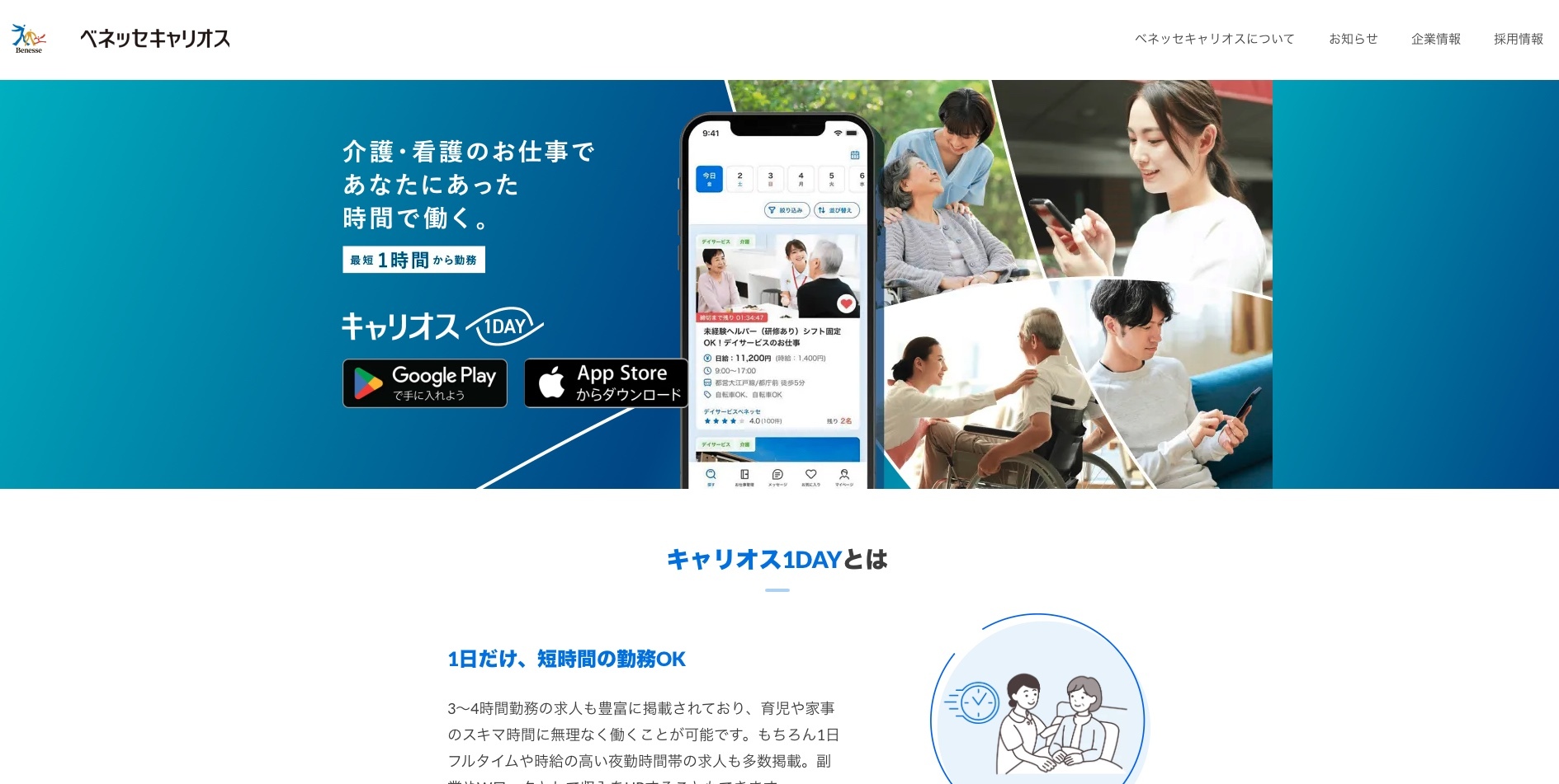 キャリオス1DAYは、介護・看護の単発・スポット求人を探しやすいサービスです。数時間単位の仕事や単日勤務を探したい人にとって、用途がはっきりしています。