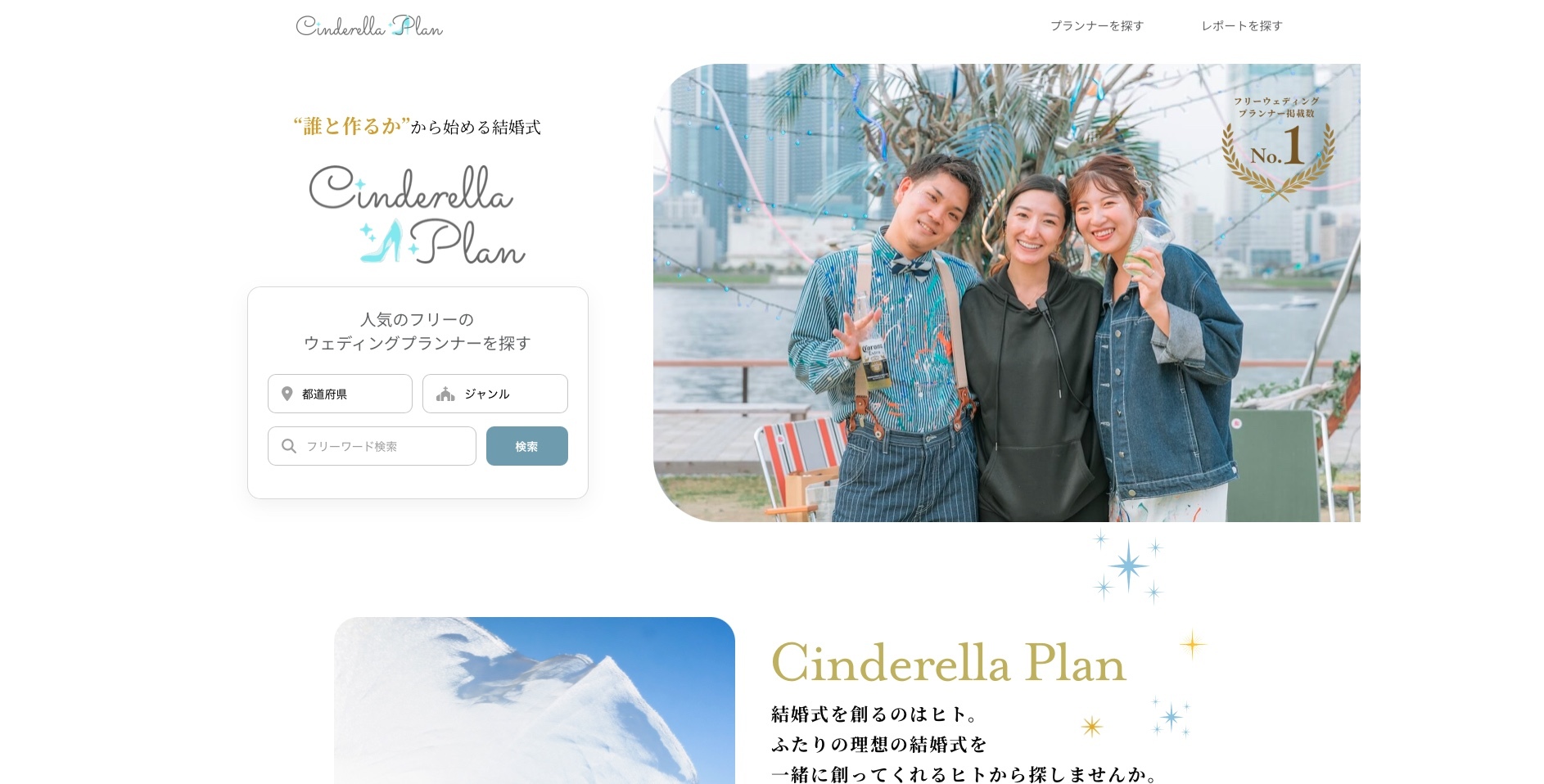 Cinderella Plan(シンデレラプラン)は、フリーウェディングプランナーと新郎新婦のマッチングサイトです。公式サイトでは、都道府県やジャンルからウェディングプランナーを探せるほか、ウェディングレポートや口コミも確認できます。トップページでは「誰と作るかから始める結婚式」と案内されており、式場から探すのではなく、自分たちに合うプランナーを見つけて結婚式を考えたい人に向くサービスとして設計されています。プロフィールや実績を見ながら比較しやすく、自由度の高い結婚式を検討したい人にとって参考にしやすいサービスです。