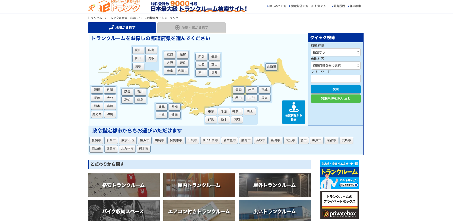 eトランクは、全国の収納スペースを検索できるトランクルーム専門サイトです。屋内型トランクルーム、屋外型コンテナ、バイクボックスなどに対応しており、問い合わせも簡単です。「どの地域にどんなタイプの収納スペースがあるか」を一覧で見比べたい人に向いています。