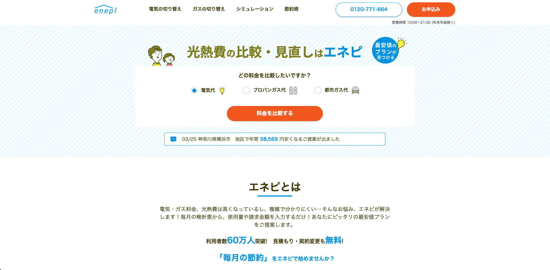エネピの強みは、プロパンガスの料金比較です。LPガスは料金差が出やすいため、会社の見直しだけで光熱費が変わる余地があるのが特徴です。