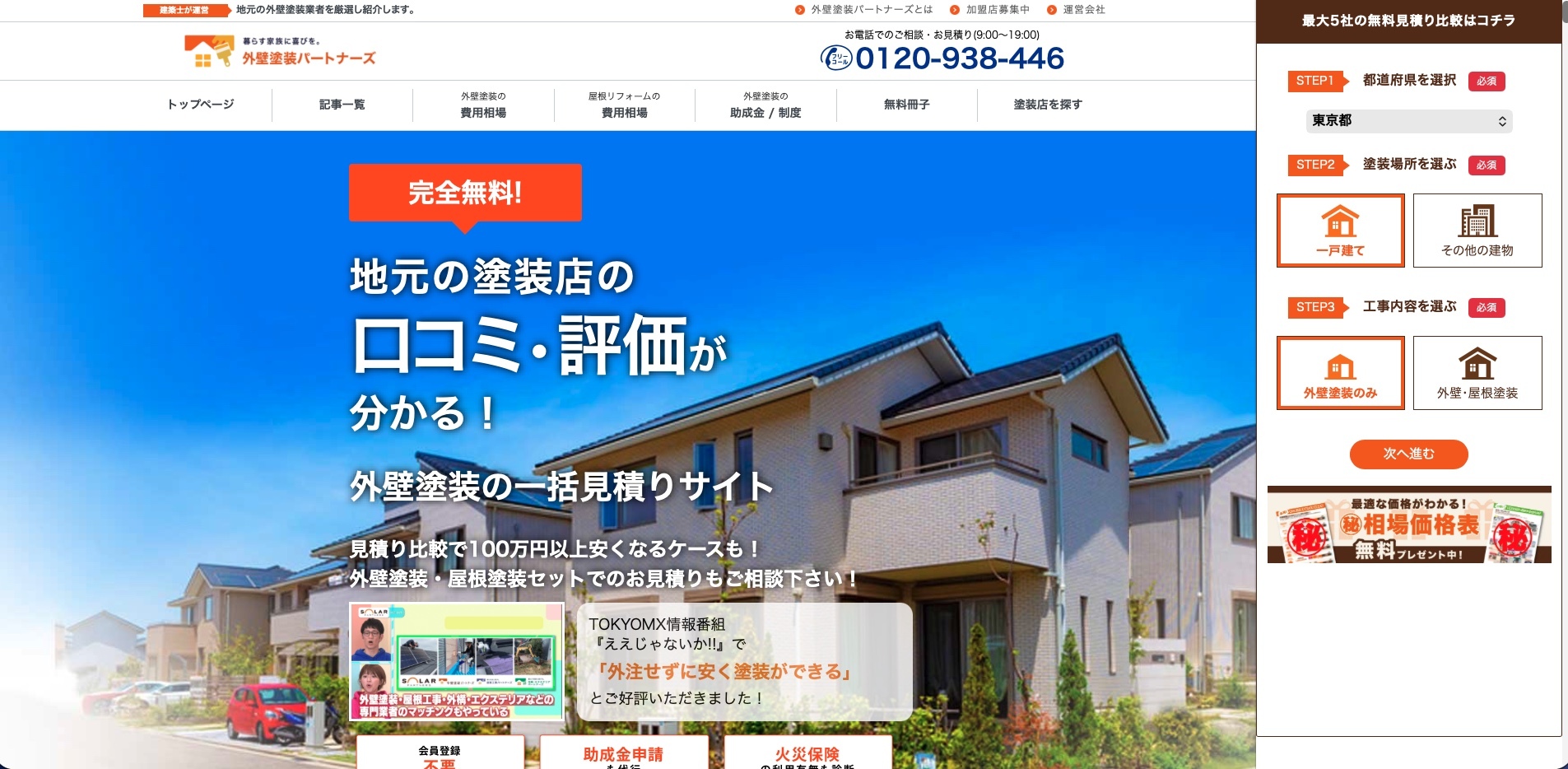 総合リフォームサイトとは違い、外壁・屋根塗装にテーマを絞っているため、塗装工事そのものの検討に集中しやすい構成です。
