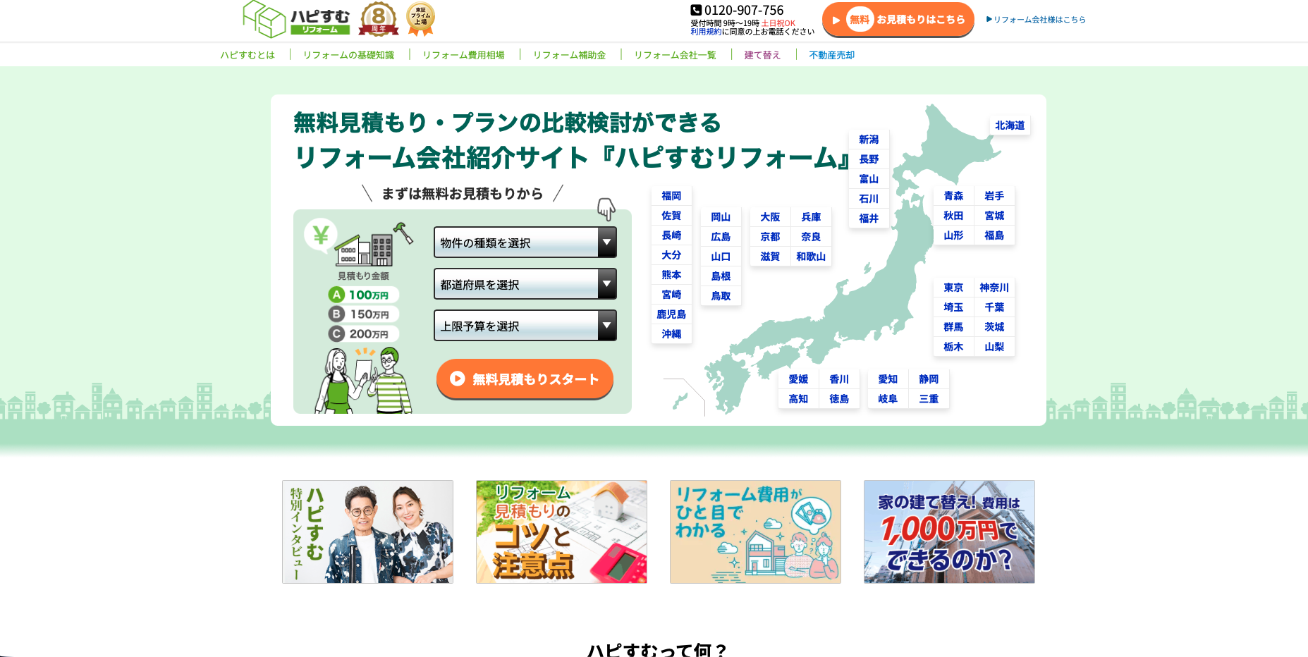 ハピすむは、無料見積もり・プラン比較に対応したリフォーム会社紹介サービスです。リフォームコンシェルジュが要望に合う会社を案内してくれるため、比較サービスの中でもサポート寄りの使い方がしやすいタイプです。