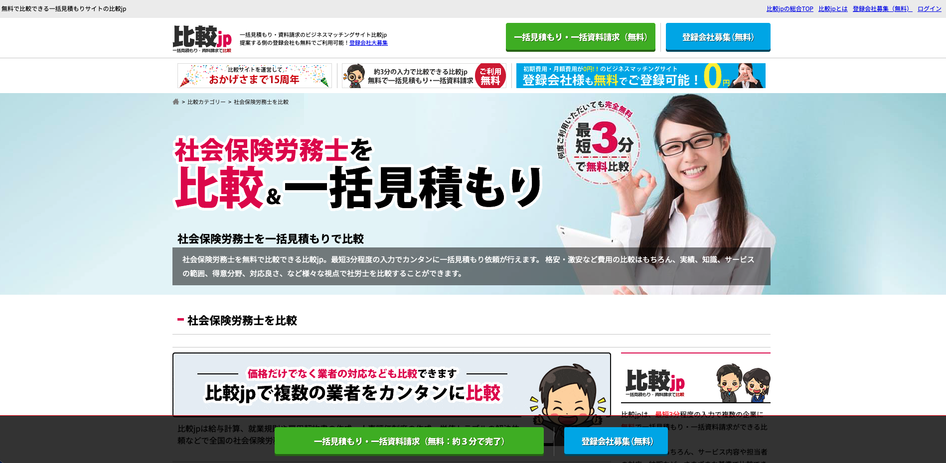 比較jpは、社会保険労務士を無料で比較できる一括見積もりサービスです。短時間で依頼内容を入力し、候補を比較したい企業に向いています。