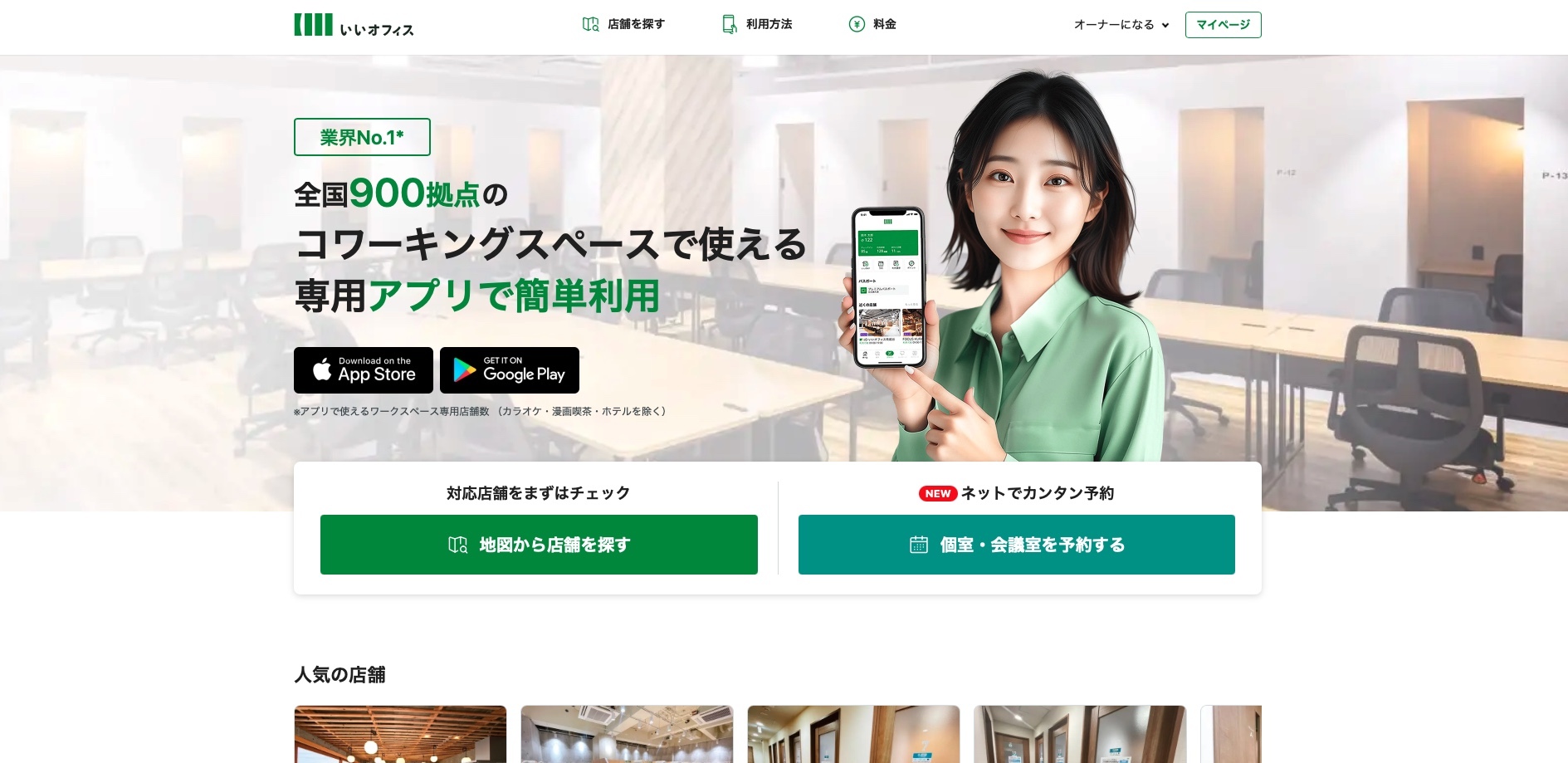 いいオフィスは、全国のコワーキングスペースを検索し、アプリ経由で利用しやすくしたサービスです。検索、チェックイン、決済までアプリ導線が整っているため、「作業場所を探す」だけで終わらず、そのまま使い始めやすいのが大きな特徴です。