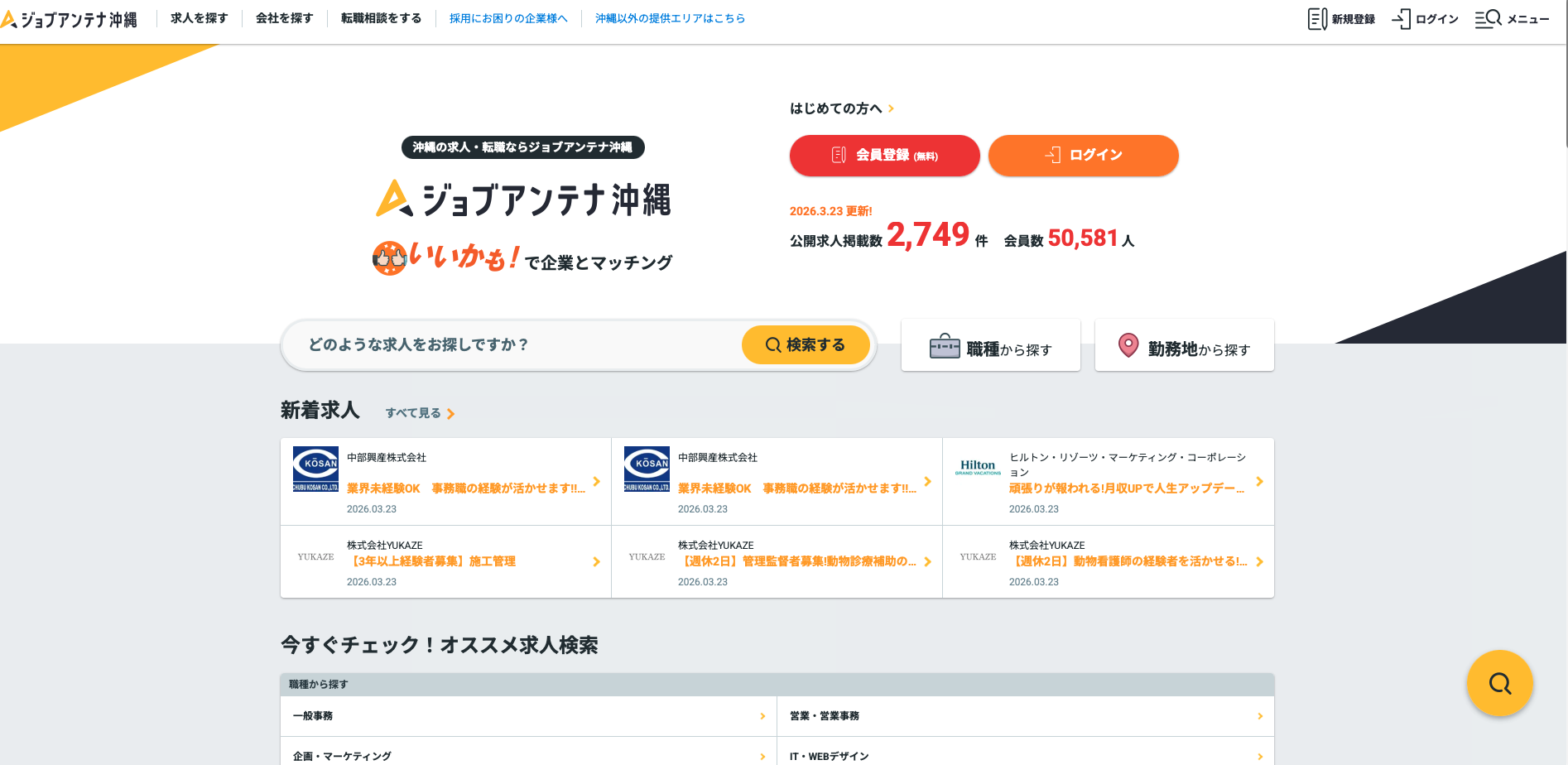 ジョブアンテナは、地域に特化した求人マッチングサービスです。沖縄を起点に展開し、現在は複数地域へ広がっています。地域ごとに求人を見やすく整理しやすいのが特徴です。