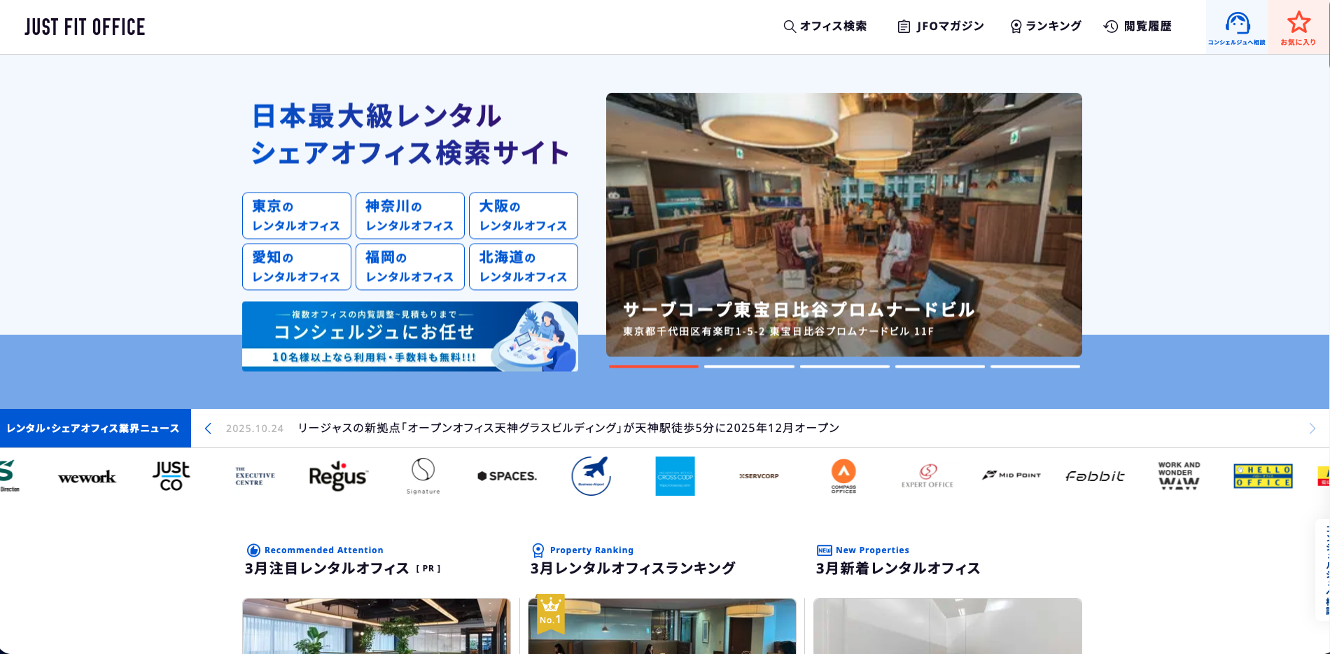 JUST FIT OFFICEは、全国のレンタルオフィス、シェアオフィス、コワーキングスペース、バーチャルオフィスを探せる検索サービスです。空室や利用料を確認しながら比較しやすいのが特徴で、まず候補を広く洗い出したい人に向いています。