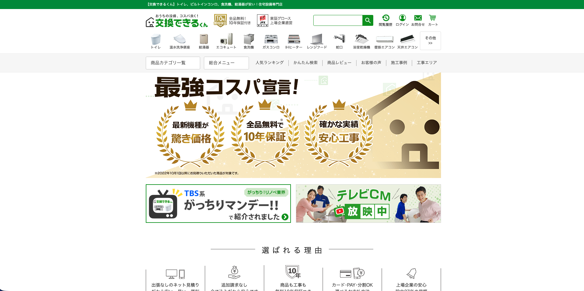 住宅設備交換では、設置直後よりも、数年後の故障対応まで見て比較することが重要です。交換できるくんは無料10年保証を案内しているため、本体価格だけでなく長期の安心感も見やすいのが特徴です。