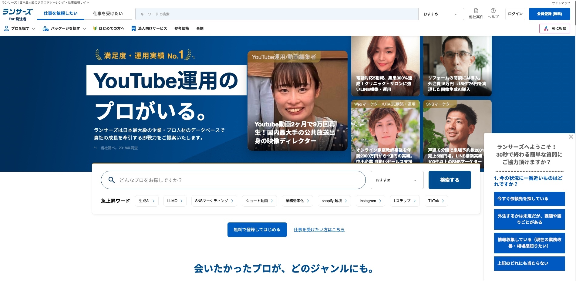 ランサーズの強みは、母集団の広さです。データ分析に完全特化しているわけではありませんが、そのぶん価格帯や提案内容を幅広く比較しやすく、初めて外注する企業にも向いています。