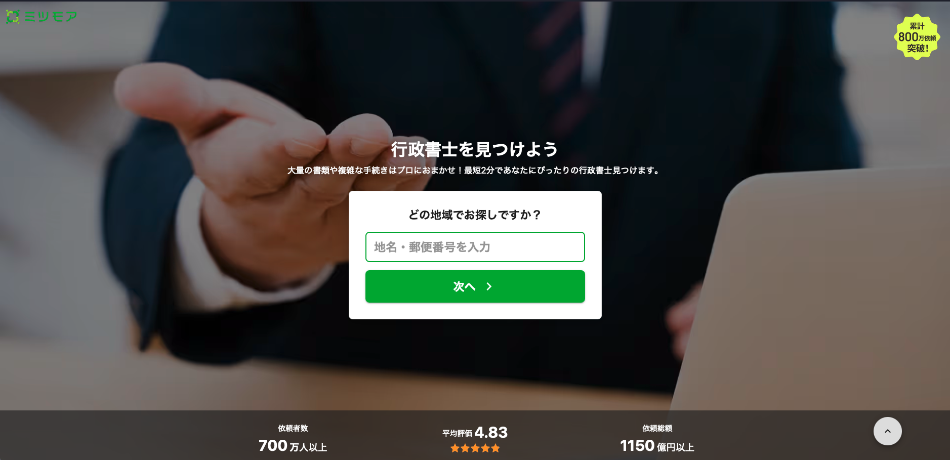 ミツモアは、行政書士を含む専門家や事業者に対して、無料で見積もり依頼を出して比較できるサービスです。行政書士カテゴリでは、会社設立、許認可申請、相続関連など、依頼内容に応じて候補を探しやすい構成になっています。
