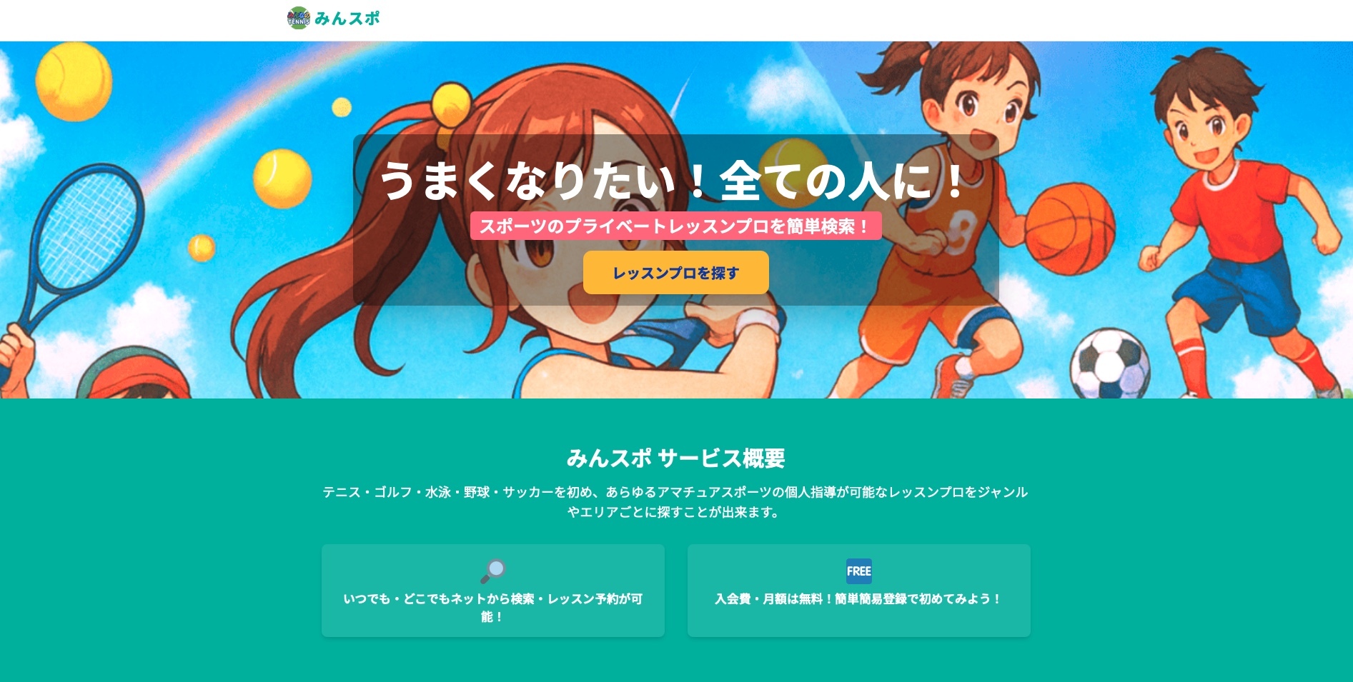 みんスポの魅力は、競技やエリアからコーチを探せること、入会費・月額無料で始めやすいこと、日時や場所を指定して予約しやすいことです。集団スクールとは違い、必要な内容だけ個別に頼みやすいのが強みです。