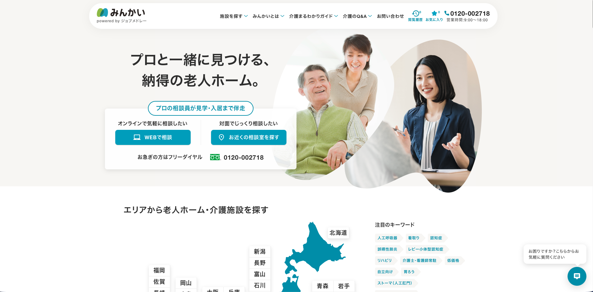 みんかいは、老人ホーム・介護施設探しの相談窓口を備えた入居支援サービスです。家族だけで条件整理しにくい場面でも相談しやすいのが特徴で、施設探しの進め方がわからない人にも使いやすい導線があります。