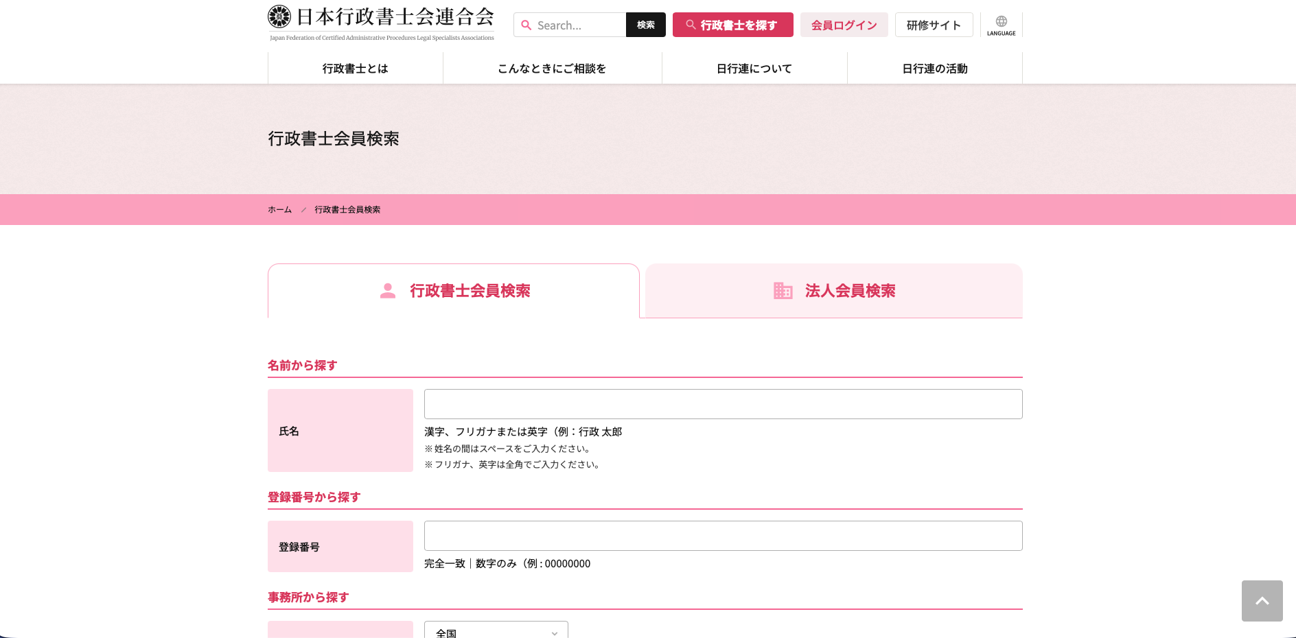 行政書士を探すうえで、まず公的な団体の会員検索を見ておきたい人に向くのが、日本行政書士会連合会の行政書士会員検索です。比較サイトとは役割が違い、候補探しの出発点として使いやすいサービスです。