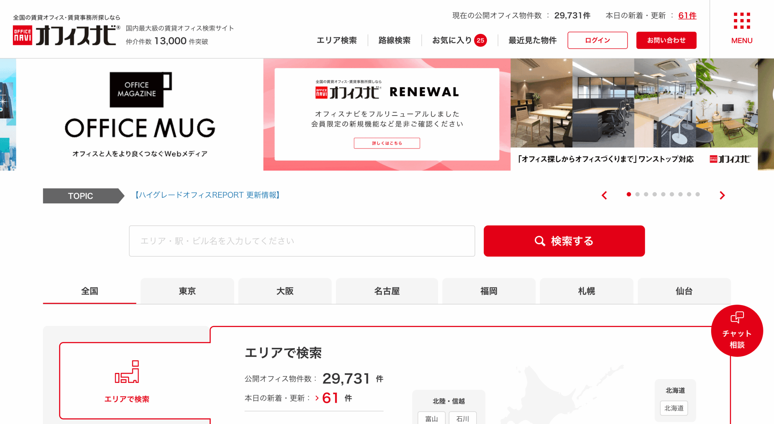 オフィスナビは、全国対応の広さと、移転相談までつなげやすい導線が魅力です。検索ポータルとして使えるだけでなく、法人のオフィス開設・移転実務に寄り添いやすい点が他サービスと比べた強みです。