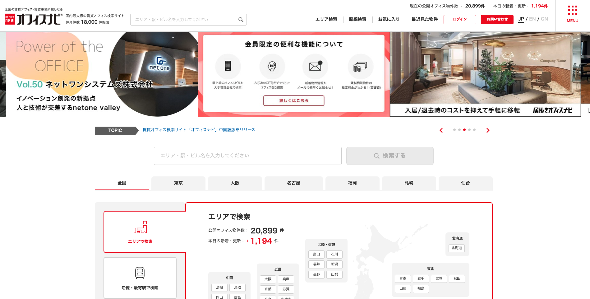 オフィスナビは、東京・大阪・名古屋・福岡・札幌・仙台など主要都市を含む全国対応のサービスです。本社移転だけでなく、支店開設やエリア拡大の場面でも比較しやすく、地域ごとに別サービスを使い分ける手間を減らしやすいのが魅力です。
