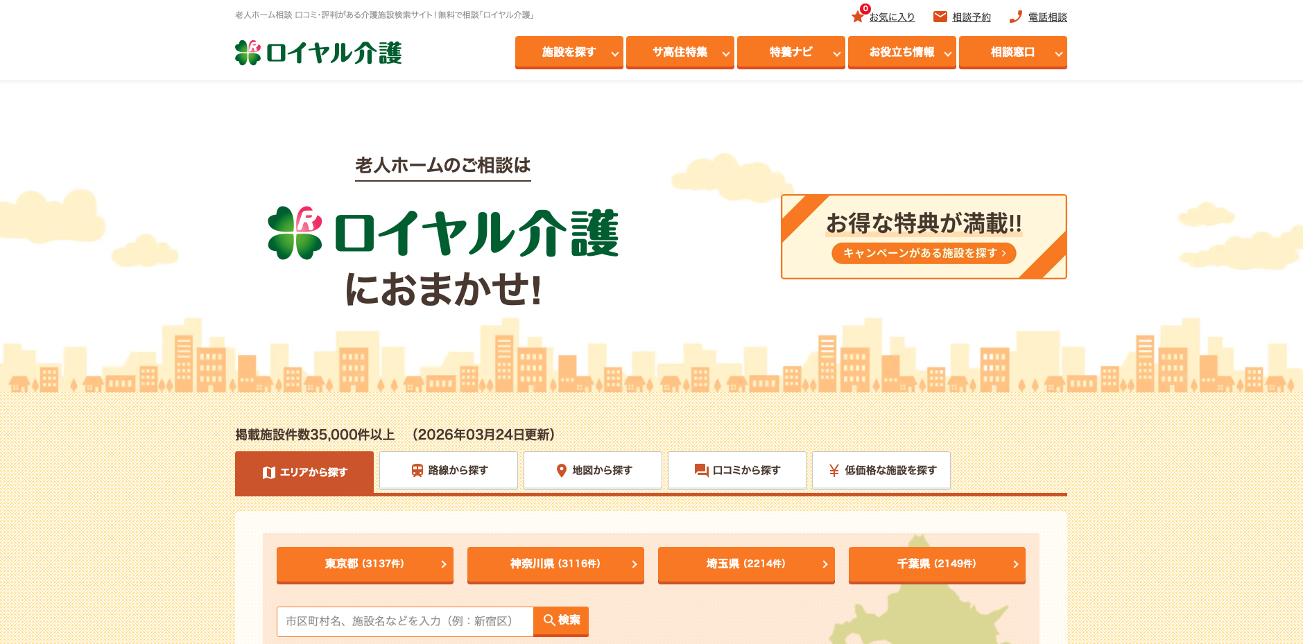 ロイヤル介護は、首都圏を中心に老人ホームや高齢者住宅探しを支援する相談サービスです。来店・電話・出張・オンラインと相談方法が多く、対面で進めたい人にも使いやすいのが特長です。