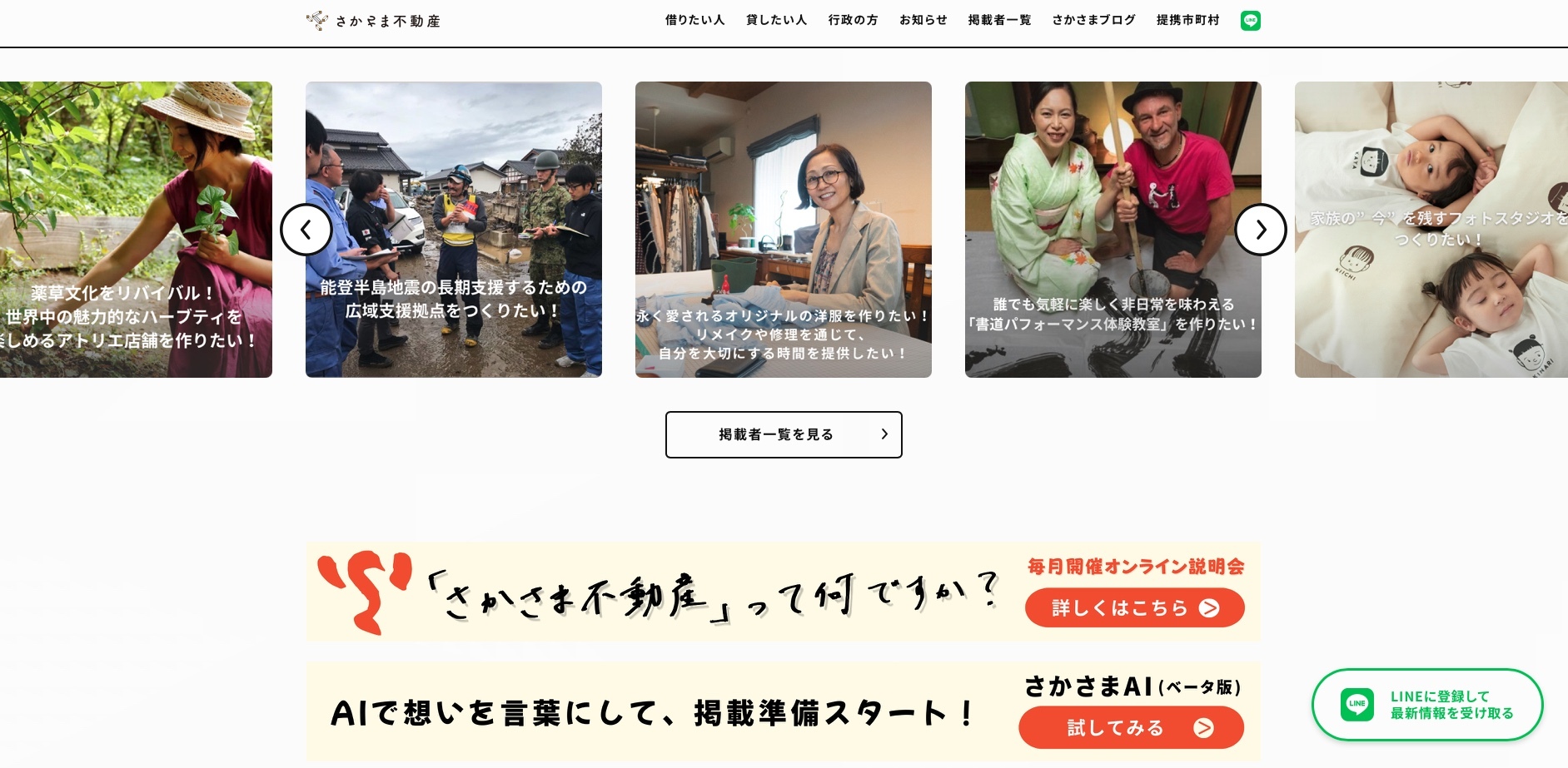借り手の挑戦内容が伝わりやすく、地域とつながりやすい点が魅力です。通常の条件検索では拾いにくい出会いを生みやすいタイプのサービスです。