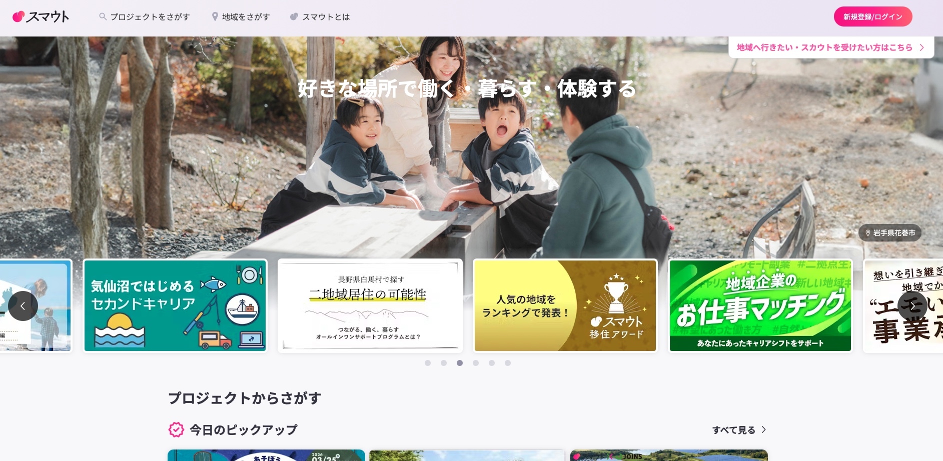 SMOUTは、地域に行きたい人、移住したい人、地域と関わりたい人が、全国の地域とつながれるサービスです。求人サイトと違い、仕事だけでなく、地域プロジェクトやイベント、体験の募集も見られるため、移住前の情報収集に使いやすいのが特徴です。