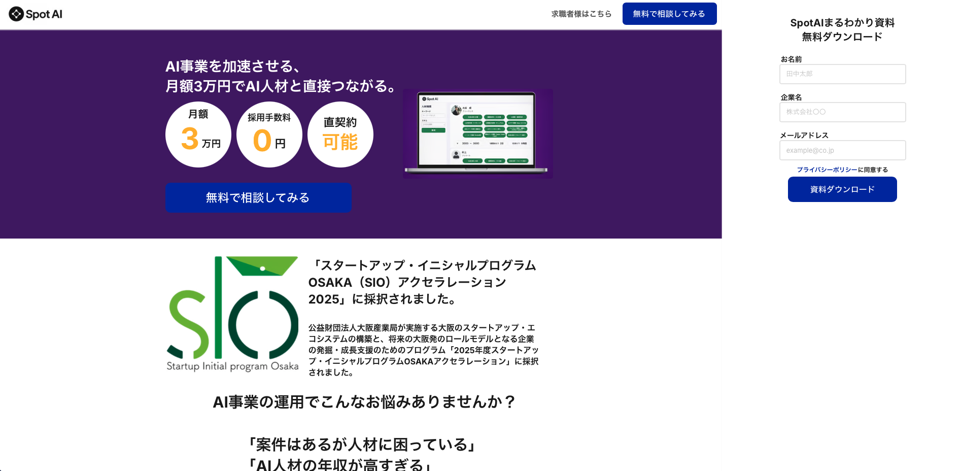 SpotAIの大きな特徴は、月額3万円というわかりやすい料金設計です。AI人材サービスは成果報酬型が多い中で、固定費で始めやすいのは比較しやすいポイントです。