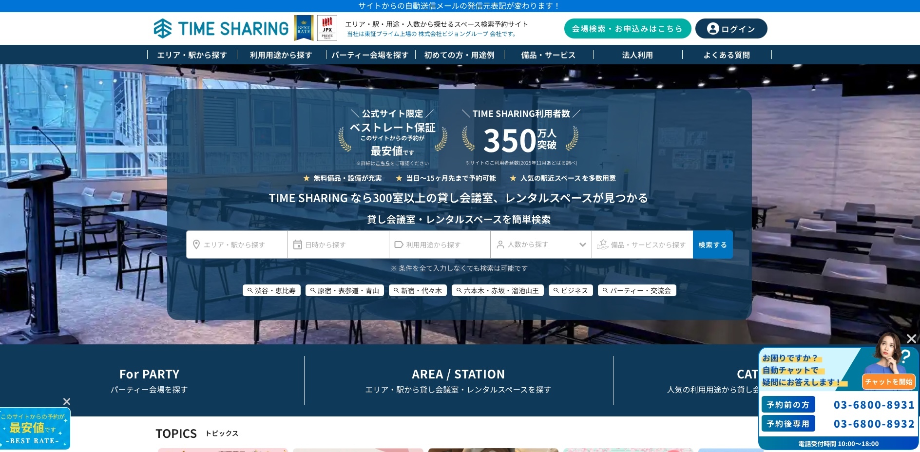 TIME SHARINGは、会議室、レンタルスペース、パーティー会場などを予約できるサービスです。貸し会議室マッチングサービスとして見ると、会議用途に加えて、説明会やセミナー、イベントにも広げやすいのが特徴です。