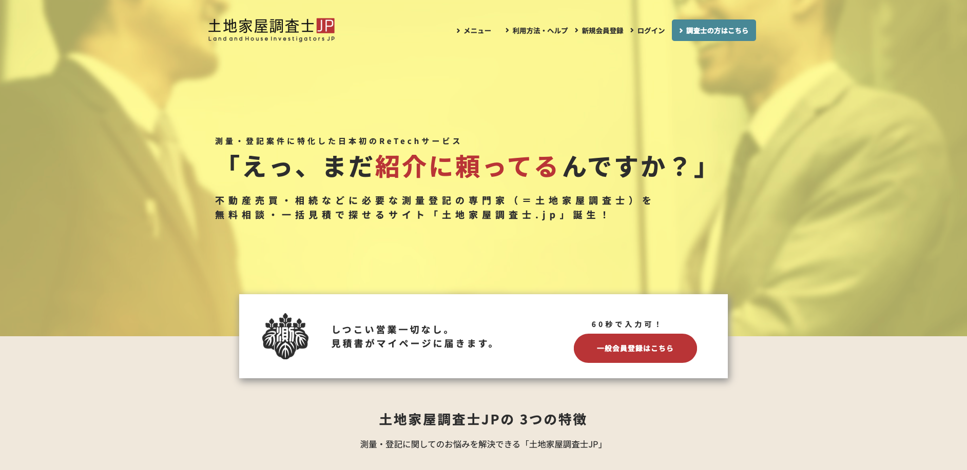 土地家屋調査士JPは、土地や建物に関する測量登記の依頼先を探したい人と、土地家屋調査士をつなぐサービスです。