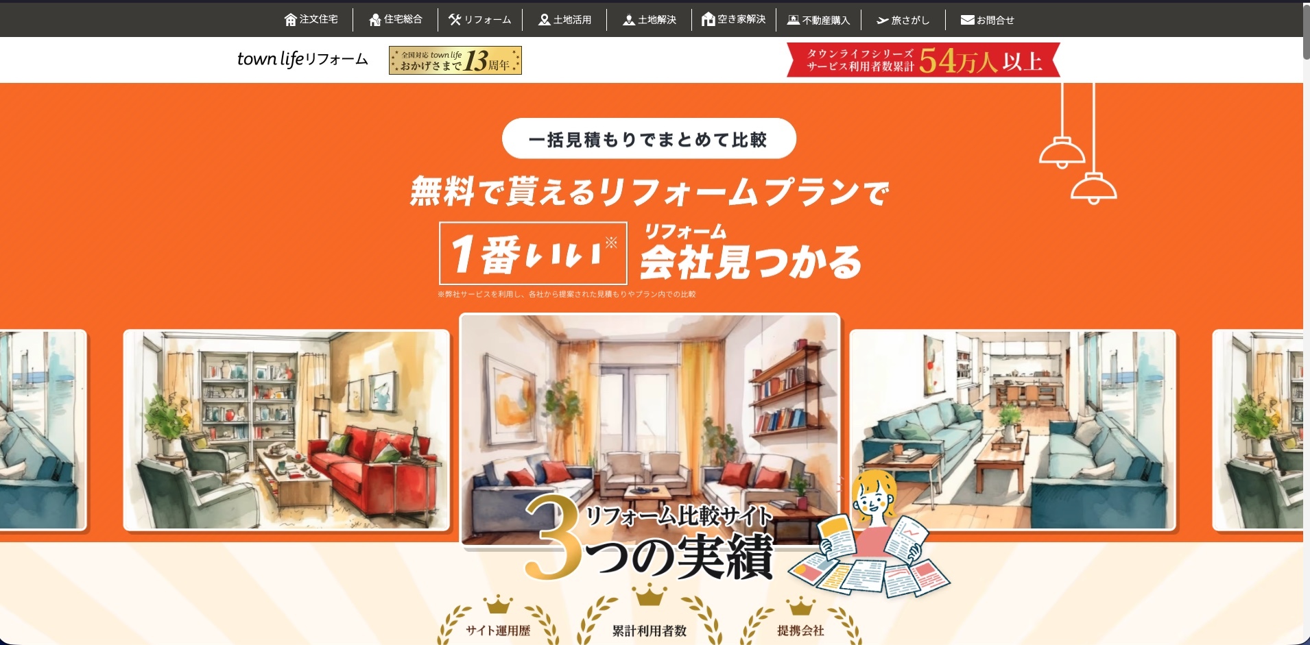 タウンライフリフォームは、住宅リフォームを考えているユーザーが、複数社から見積もりやプラン、アドバイスを受け取りながら比較できるサービスです。