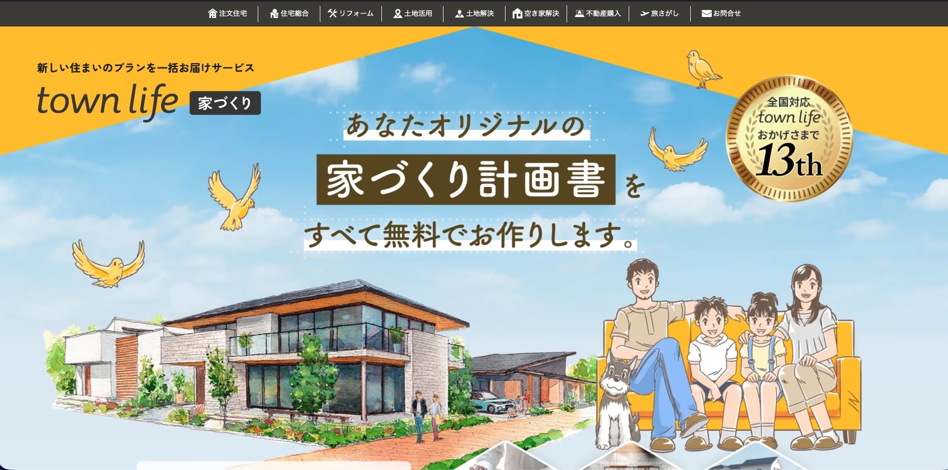 タウンライフ家づくりは、条件を入力することで、複数の住宅会社から家づくり計画書の提案を受けられるサービスです。「会社を探す」だけでなく、「提案を比べる」ことに重点があるのが特徴です。