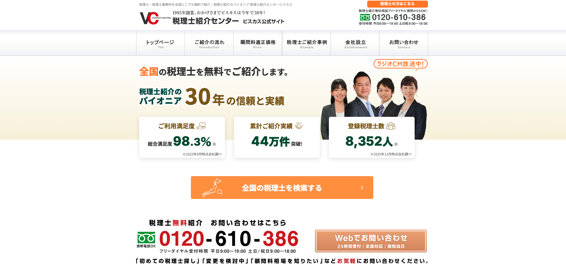 税理士紹介センター(ビスカス) 1995年創業の業界最古参。累計40万件超の紹介実績。顧問料相場表を公式公開 老舗の安心感・業種特化で探したい人