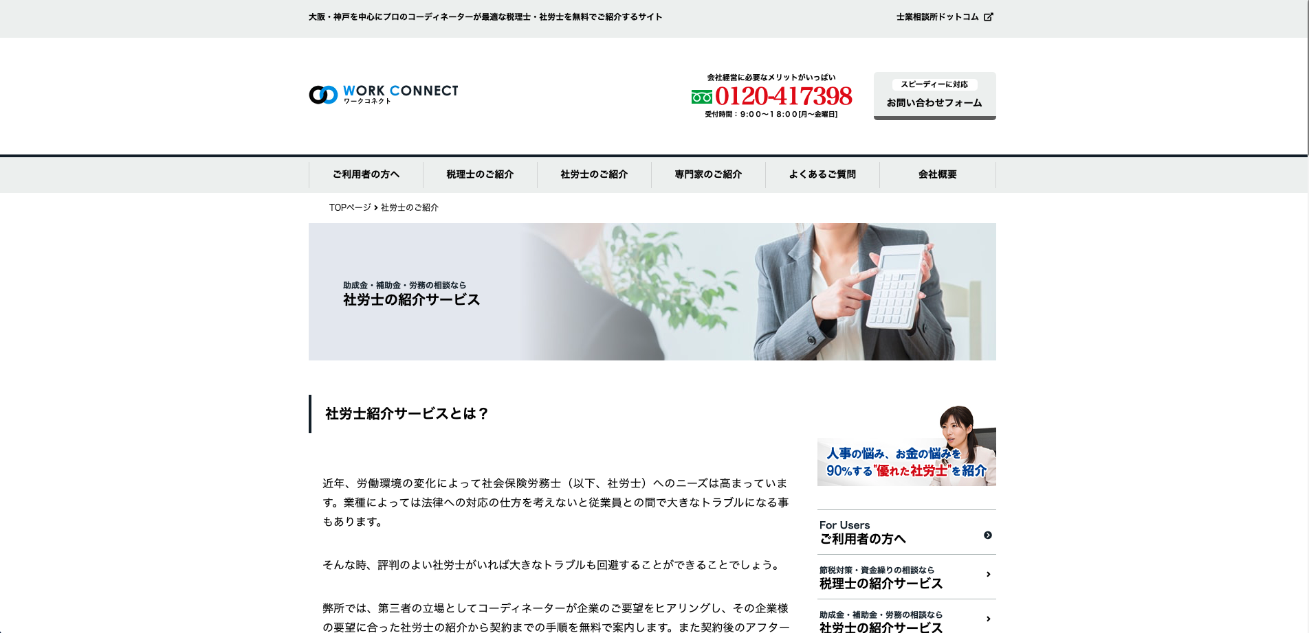 WORK CONNECTは、自社で探すより、条件に合う社労士を紹介してほしい企業に向いています。顧問変更、助成金相談、労基署対策、業種理解のある社労士探しなどで使いやすいタイプです。